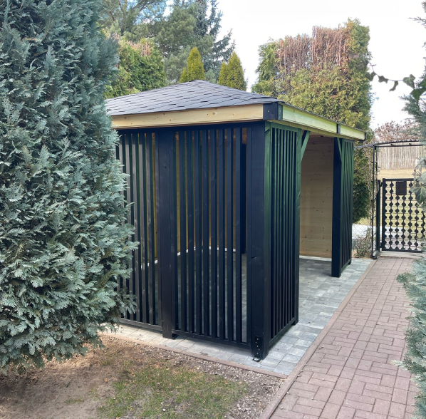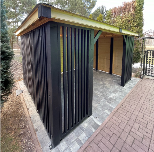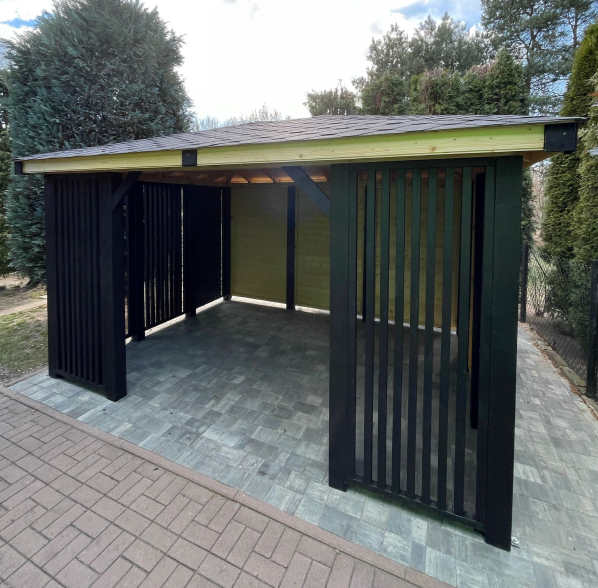 Nowoczesna altana ogrodowa o eleganckim, minimalistycznym designie, wykonana z wysokiej jakości drewna. Jej charakterystycznym elementem są pionowe lamele, które nadają konstrukcji lekkości, jednocześnie zapewniając przewiewność i subtelną osłonę przed wzrokiem. Solidny dach skutecznie chroni przed deszczem i słońcem, a przestronne wnętrze z estetycznie ułożoną posadzką stwarza idealne warunki do wypoczynku. Ciemna kolorystyka lameli w połączeniu z naturalnym drewnem dodaje całości nowoczesnego, eleganckiego charakteru, czyniąc altanę stylowym miejscem relaksu w ogrodzie.