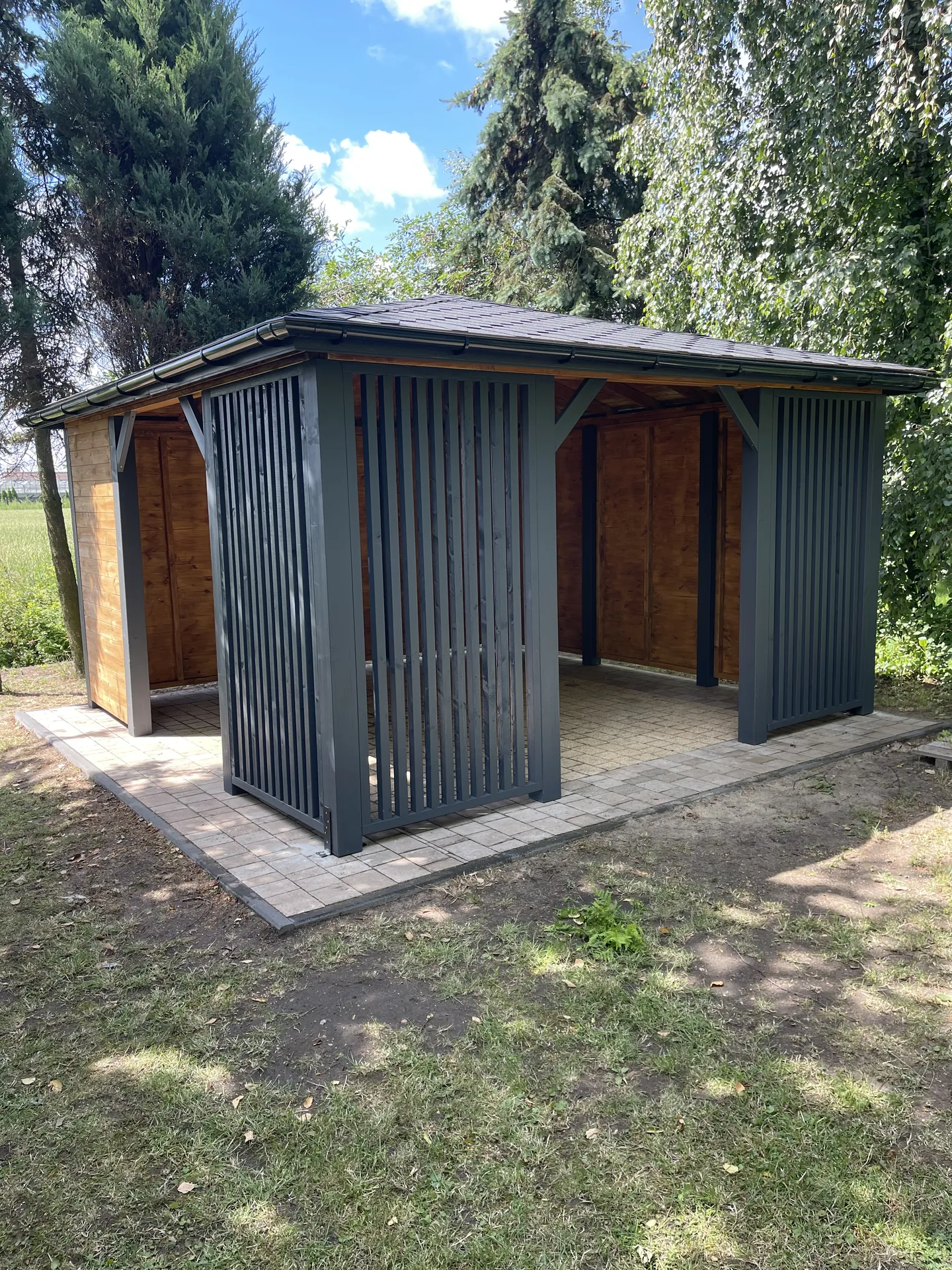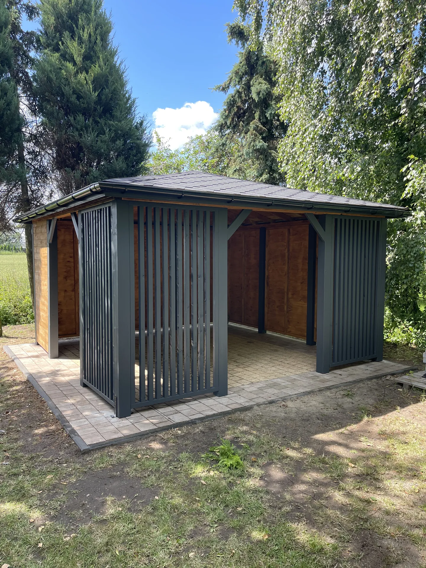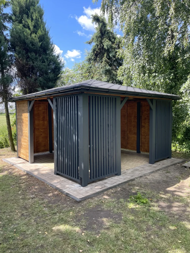 Wykończenie w kolorach ciepłego dębu i wulkanicznej plaży (antracyt) nadaje altanie elegancki, ponadczasowy wygląd. To zestawienie barw doskonale komponuje się z otoczeniem ogrodu, tworząc przytulną i stylową przestrzeń wypoczynkową.