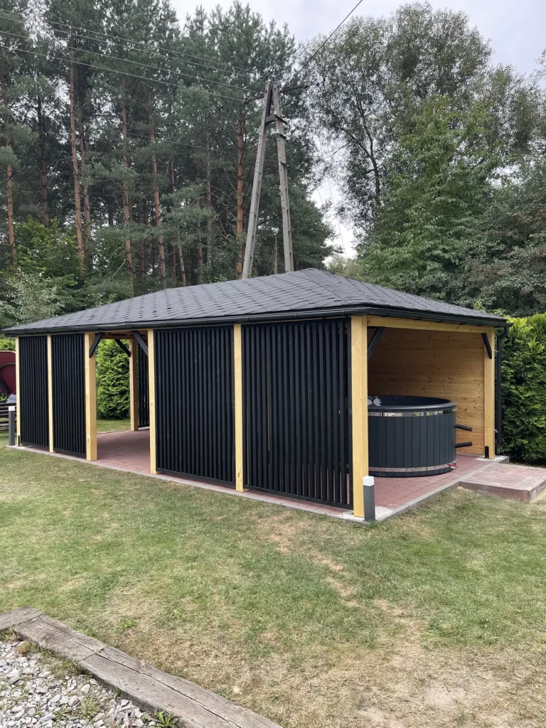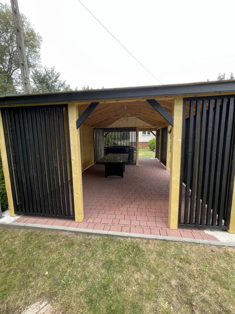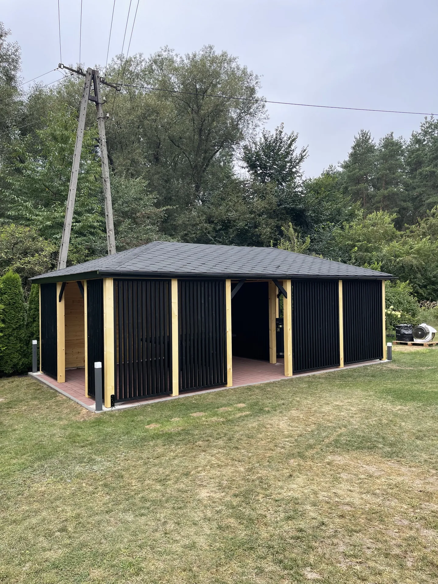 Wykończenie w kolorze czarnym i naturalnej sosny podkreśla ciepły, elegancki styl altany, a dach kryty gontem bitumicznym skutecznie chroni przed deszczem i słońcem. To idealne połączenie estetyki i funkcjonalności – miejsce stworzone do relaksu przez cały rok.