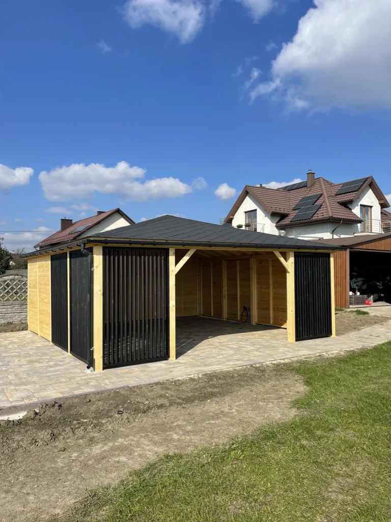 Połączenie kolorów sosna naturalna i czarny nadaje altanie wyjątkowego, eleganckiego charakteru. Ciepły ton drewna kontrastuje z czarnymi detalami, tworząc nowoczesny i ponadczasowy efekt. Jedna ściana pełna z deski na pióro–wpust zapewnia osłonę przed wiatrem i prywatność, a dach kryty gontem bitumicznym chroni konstrukcję przed deszczem i słońcem.