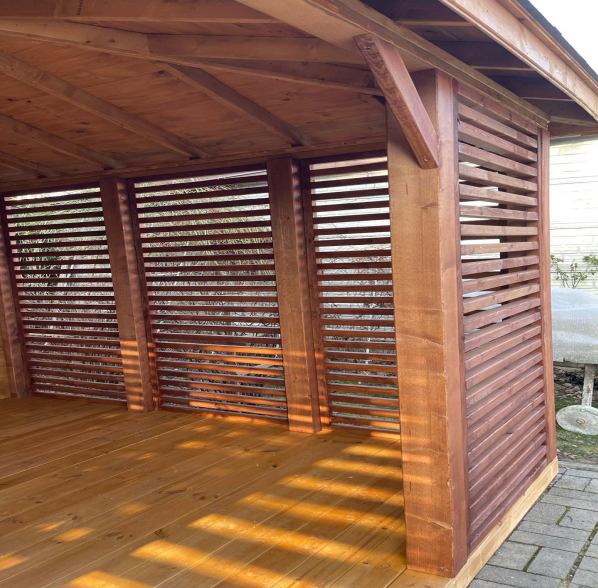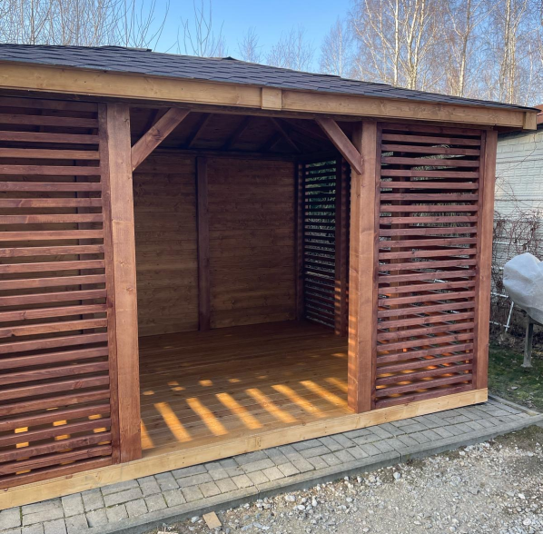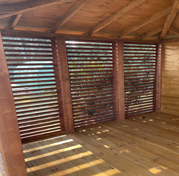 Nowoczesna altana Julia to doskonałe rozwiązanie dla osób ceniących funkcjonalność i styl. Zamknięta konstrukcja z eleganckimi, drewnianymi lamelami zapewnia prywatność, jednocześnie pozwalając na swobodny przepływ powietrza. Solidne zadaszenie chroni przed deszczem i intensywnym słońcem, dzięki czemu można z niej korzystać w każdą pogodę. Wnętrze altany oferuje przestrzeń która może służyć do wypoczynku czy organizacji spotkań.