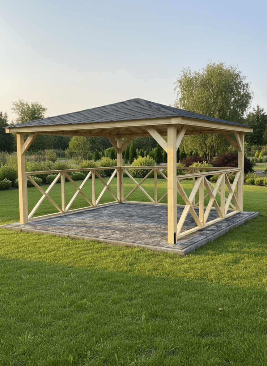 Elegancki design w Twoim ogrodzie! Nowoczesna altana z solidnego drewna w połączeniu z czarnymi akcentami to idealne miejsce na relaks, grill czy rodzinne spotkania. Postaw na styl i funkcjonalność w swoim ogrodzie!